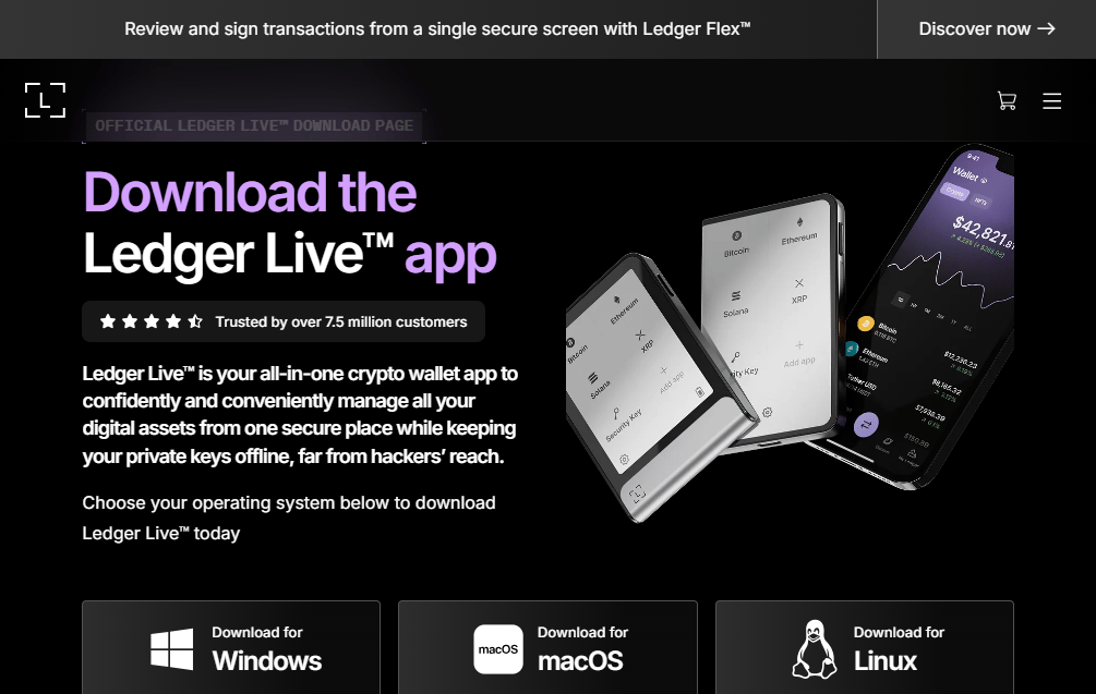 Here, you’ll find the Ledger Live download link — available for Windows, macOS, Linux, iOS, and Android.